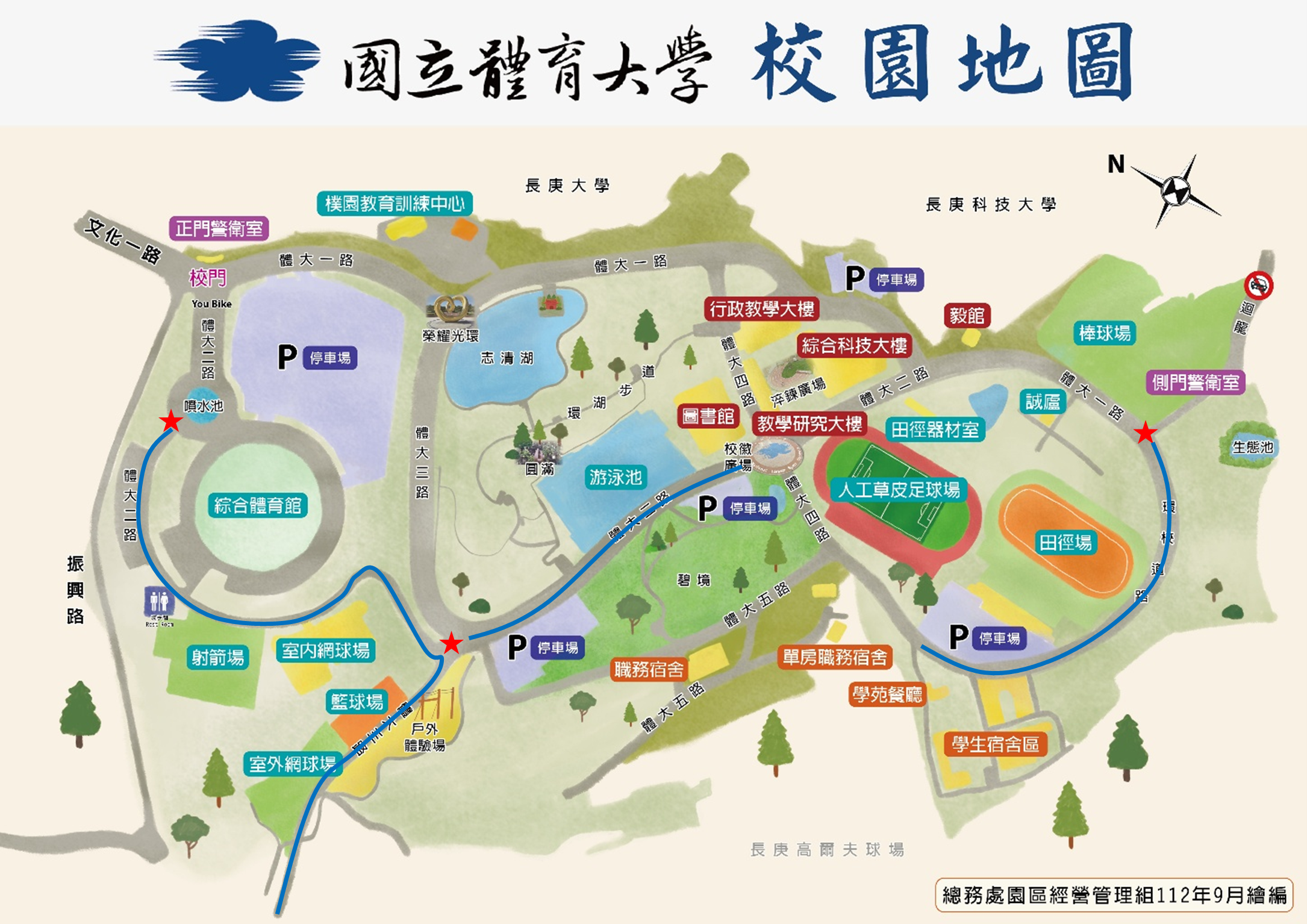 1.體育館圓環往射箭場方向至體大二、三路口(五叉路口小圓環)室外籃球場、側門。