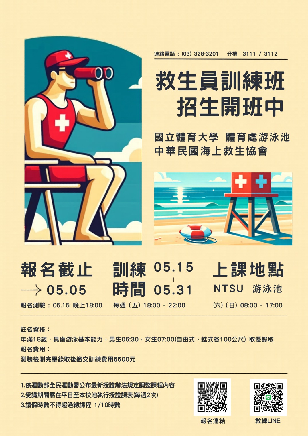 為培養水域安全與救生專業能力,國立體大游泳池辦理「115年度游泳救生班」,相關資訊如下,歡迎有興趣之同學踴躍報名參加。